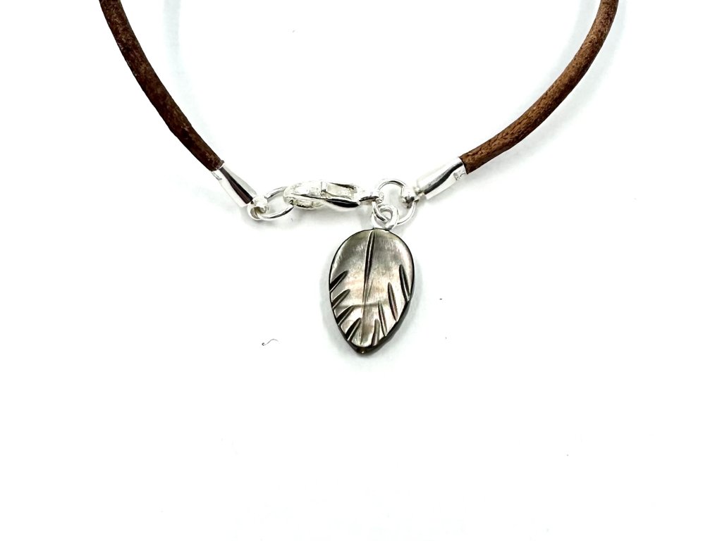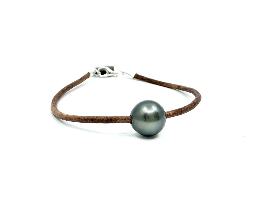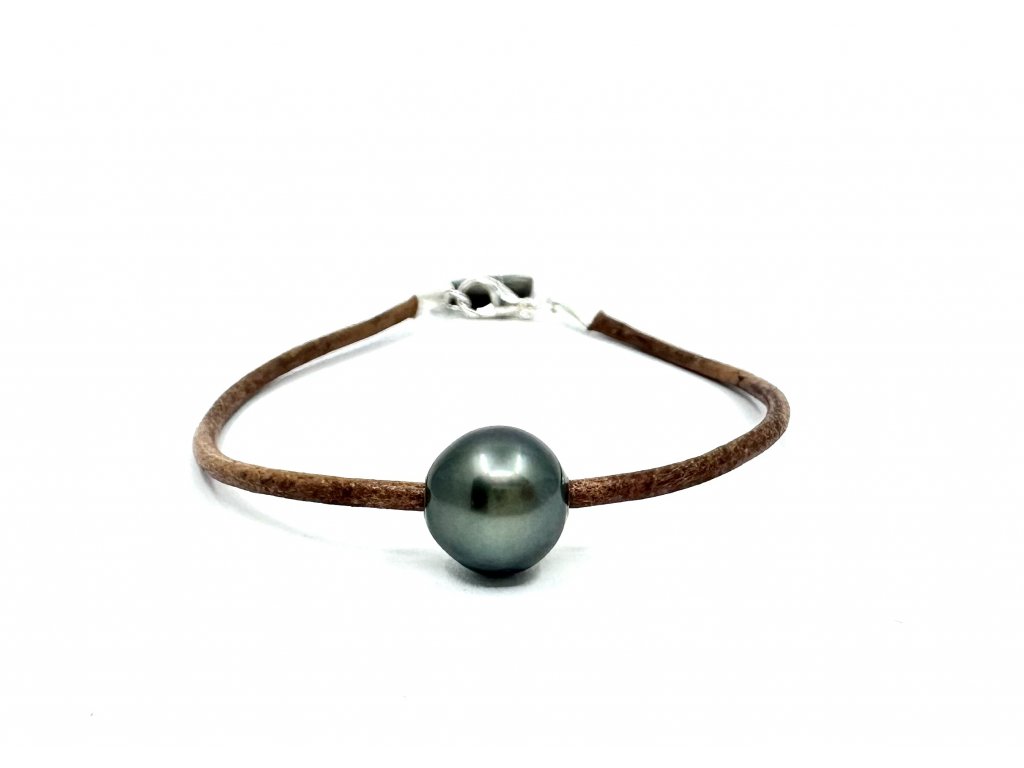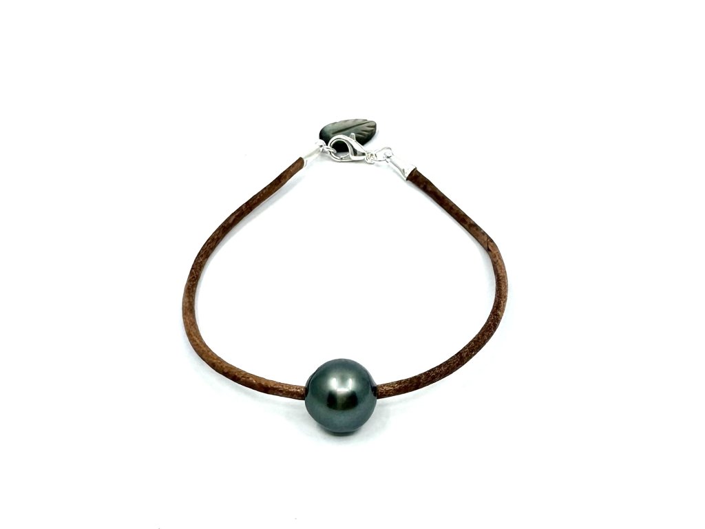 Kožený náramek s tahitskou perlou. Perla má polo kulatý tvar a vysoký lesk. Perla má drobné nerovnosti na povrchu, které dokazují pravost perly. Součástí náramku je medailonek z perlorodky Pinctada Margaritifera, jež je mateřskou perlorodkou pro tahitské perly.