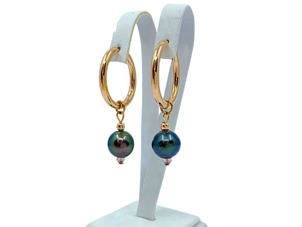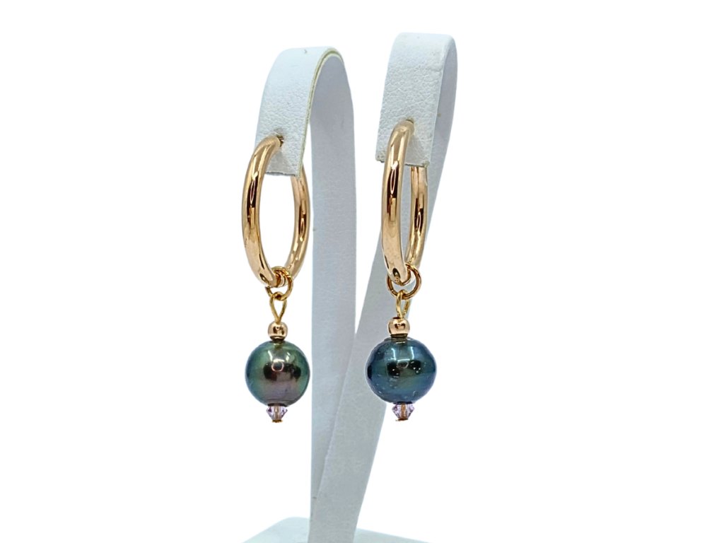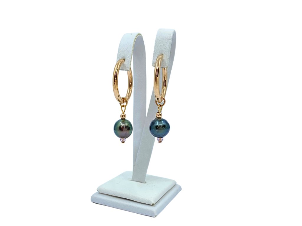 Každý pár je originál – tahitské perly vznikají v čistých lagunách Francouzské Polynésie a jsou známé svým fascinujícím spektrem tmavých odstínů. V jediné perle se prolínají tóny zelené, fialové i modré, což dává každému šperku neopakovatelný charakter. Tyto konkrétní perly jsou jemně kulaté, s vysokým leskem a přirozenou povrchovou strukturou, která svědčí o jejich pravosti.