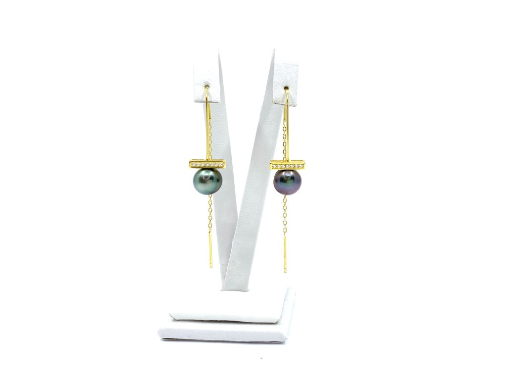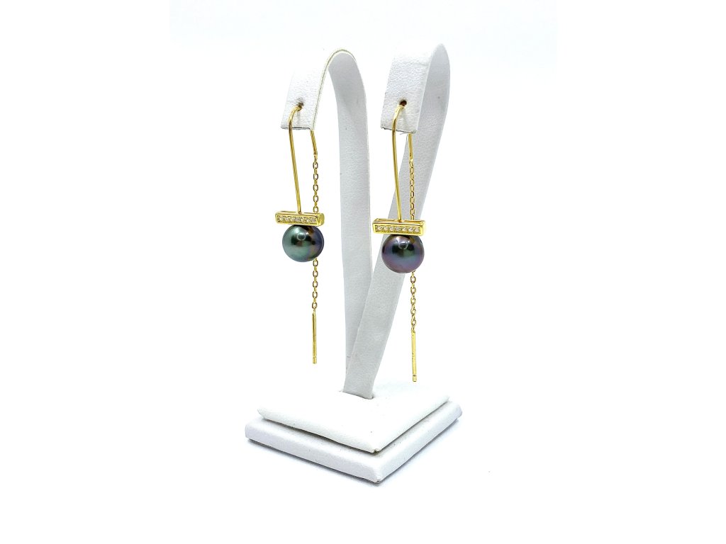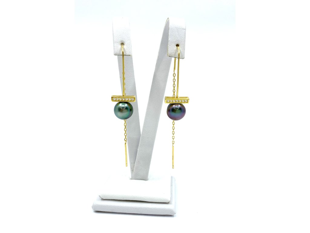 Design náušnic je založen na moderní geometrii – horizontální zlatá linie se zirkony vytváří rafinovaný kontrast k tmavému lesku tahitské perly. Tahitské perly jsou známé svou přirozenou barevností – od tmavě zelených po fialové a paví tóny – a každá z nich je jedinečný přírodní originál.
