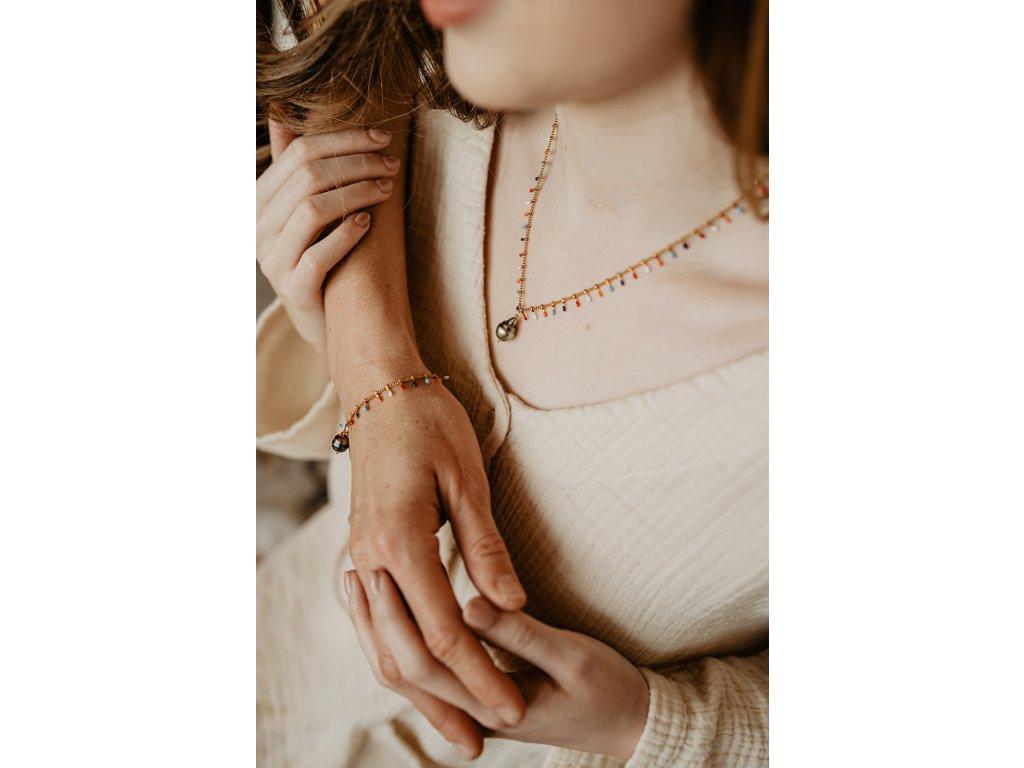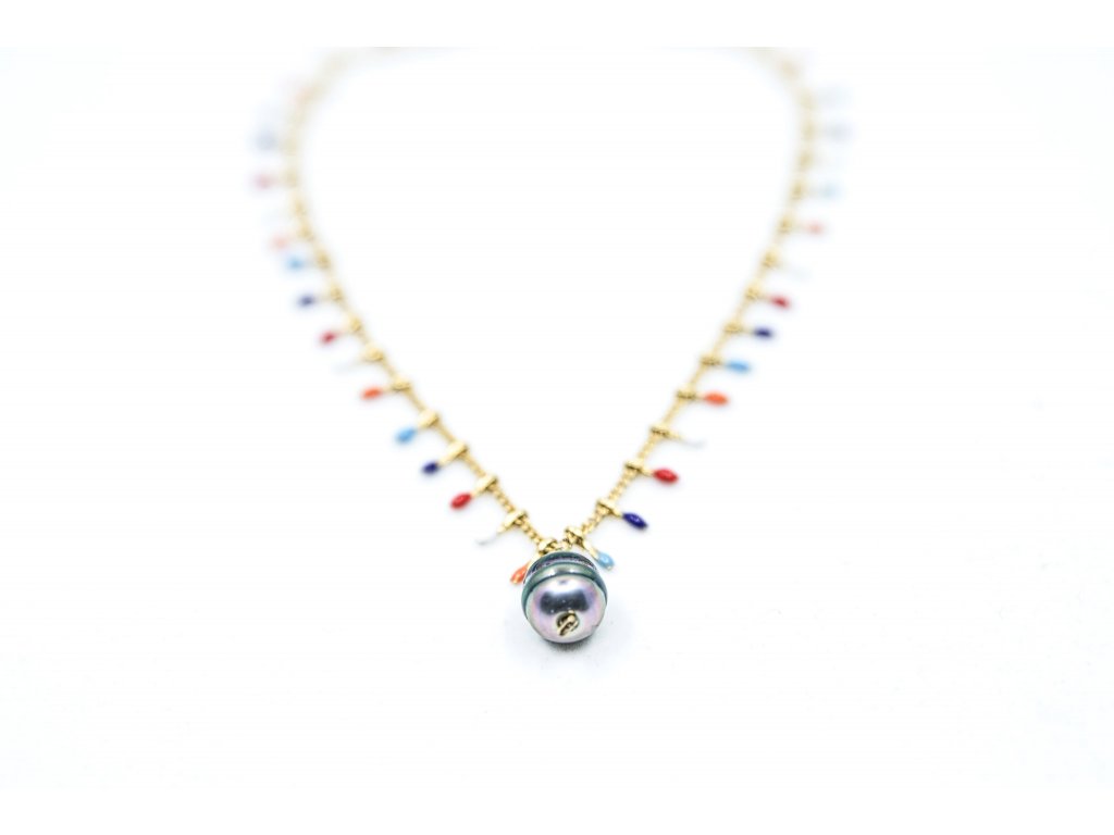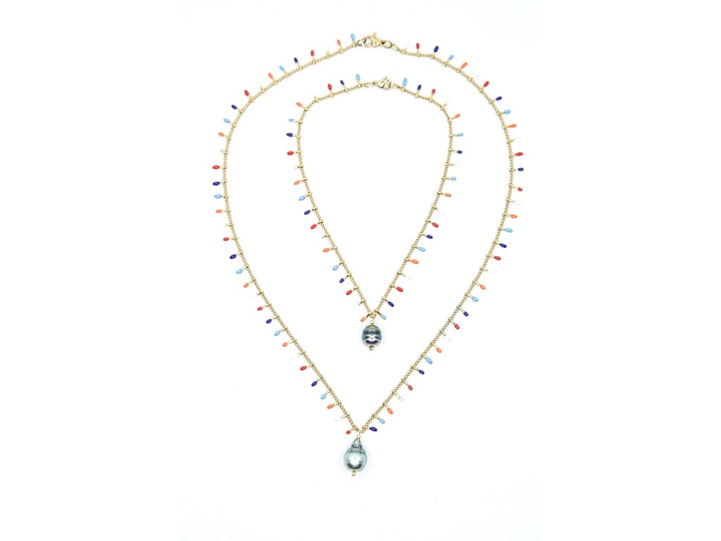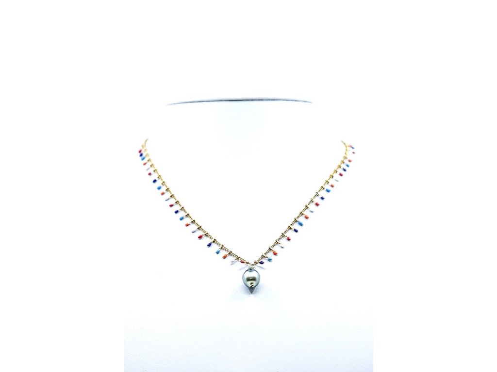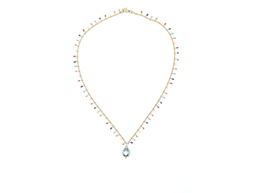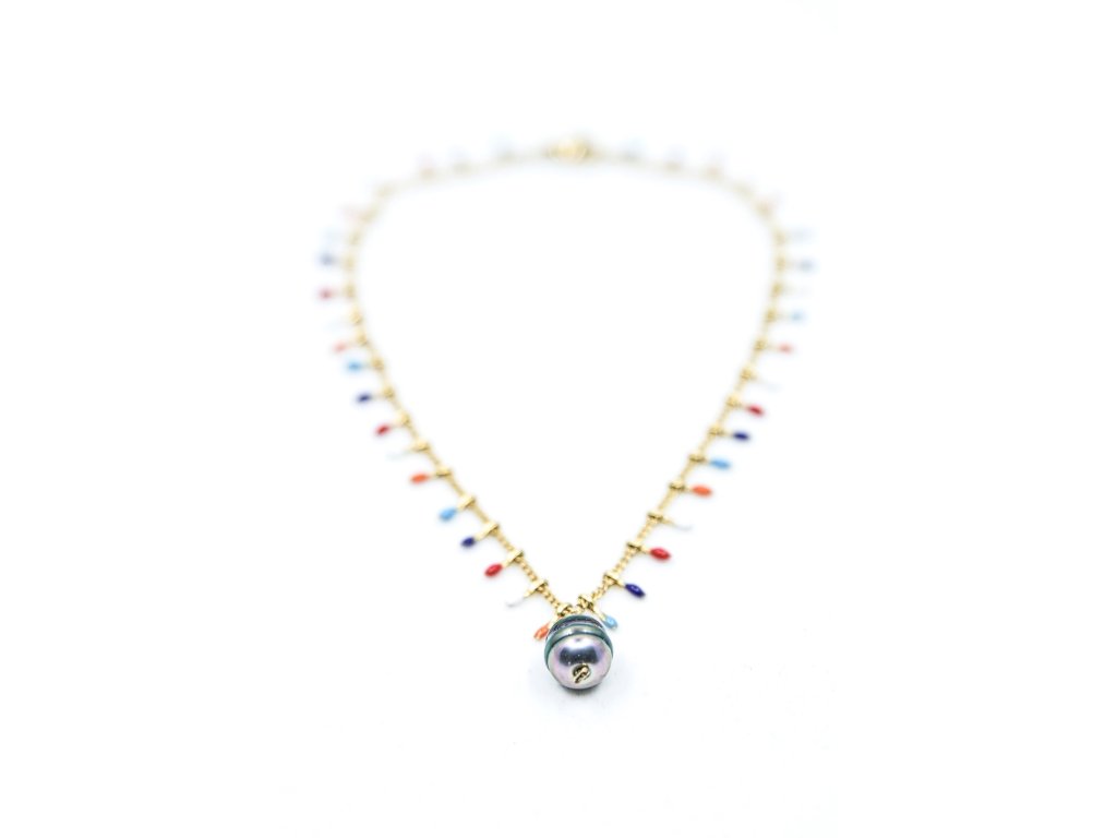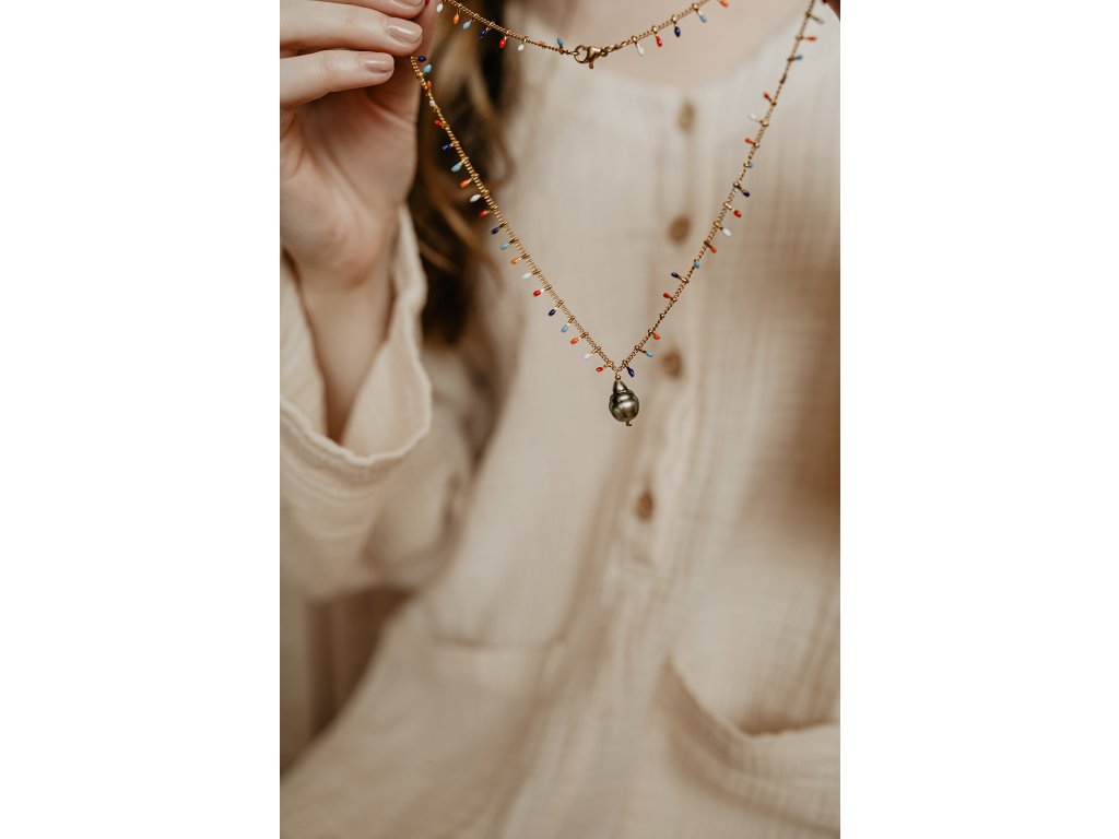 Tahitská perla visící z náhrdelníku vytváří krásný kontrast s barevnými korálky a dodává celému šperku luxusní nádech. Tento náhrdelník je ideální volbou pro ty, kteří hledají něco jedinečného a elegantního, co ozvláštní jakýkoli outfit – od běžného denního nošení až po slavnostní příležitosti.