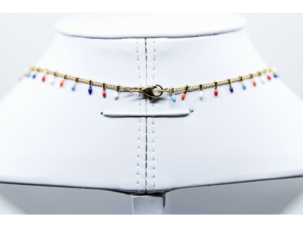 Tento nádherný náhrdelník spojuje hravost a eleganci v jednom unikátním šperku. Na jemném zlatém řetízku jsou pečlivě rozmístěné drobné barevné korálky, které dodávají šperku živý a moderní vzhled. Hlavním prvkem náhrdelníku je však pravá tahitská perla, známá pro svůj hluboký lesk a duhové odlesky.