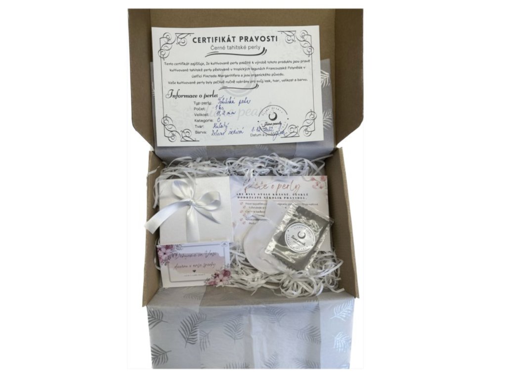 Perlový šperk je doručen v dárkové krabičce na šperky s cestovním sáčkem, Tiare Pearls certifikátem pravosti perel, čistícím hadříkem na šperky a s návodem, jak se o perly starat.