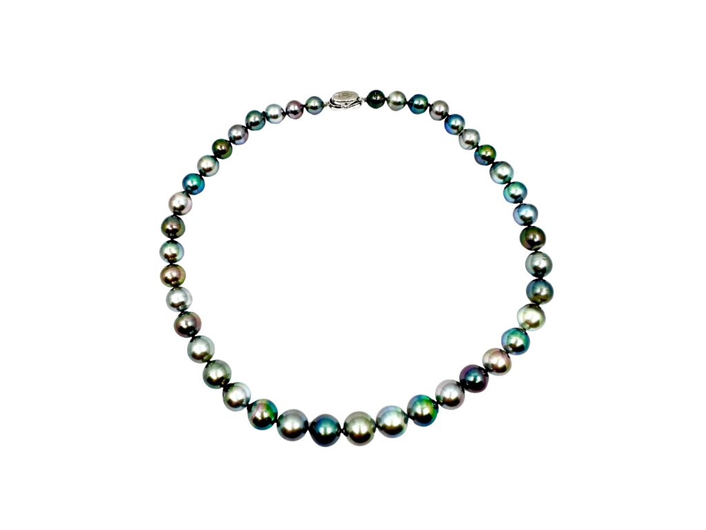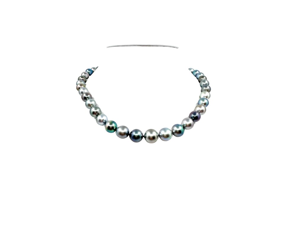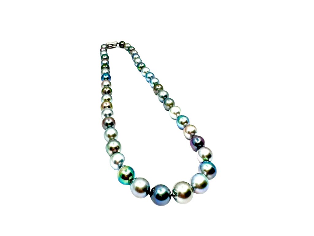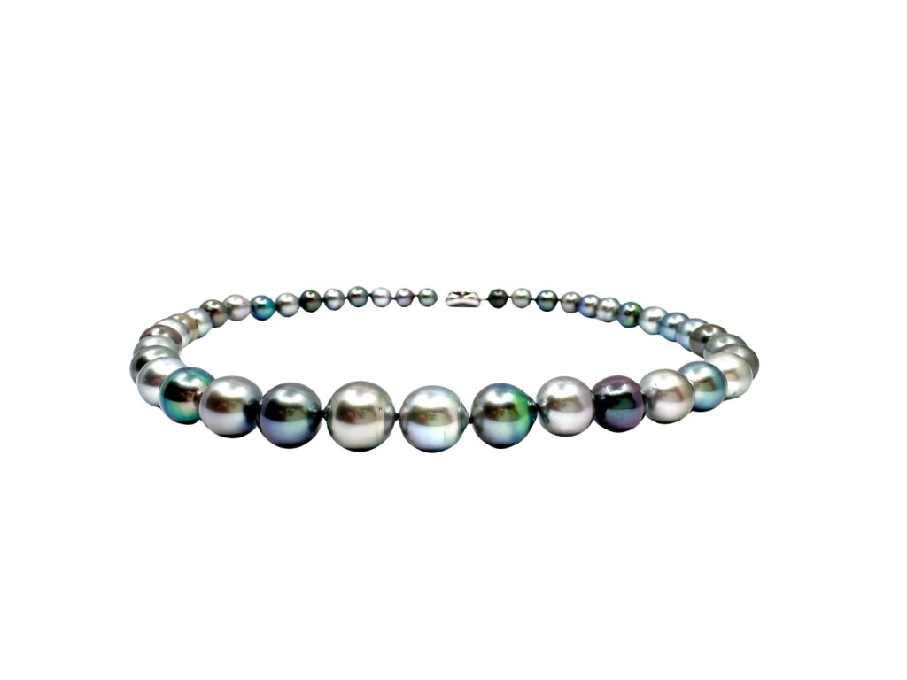 Tento dechberoucí náhrdelník z pravých tahitských perel je skutečným mistrovským dílem přírody. Každá perla je pečlivě vybraná a seřazená do plynulé kompozice odstínů – od kouřově šedé přes paví zelenou až po fialové a stříbrné tóny. Výsledkem je elegantní a přitom moderní šperk, který vyniká originalitou i luxusem.