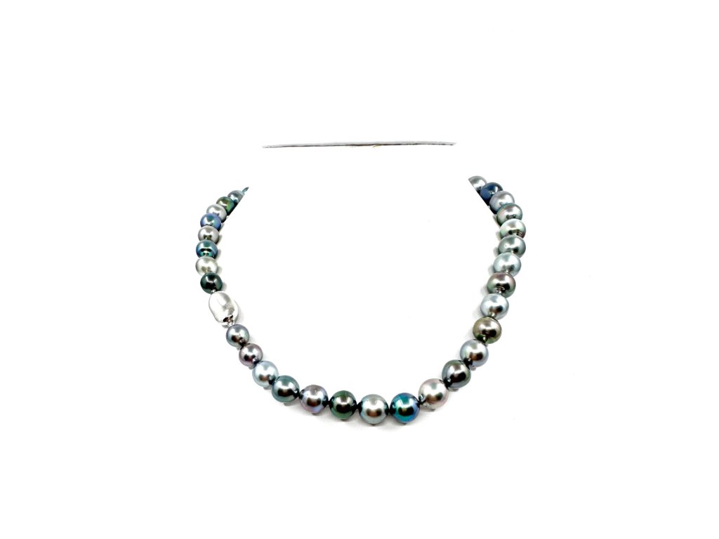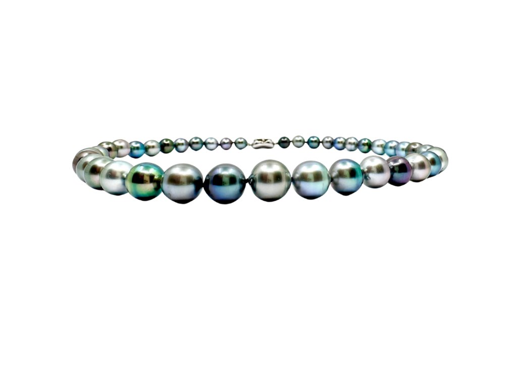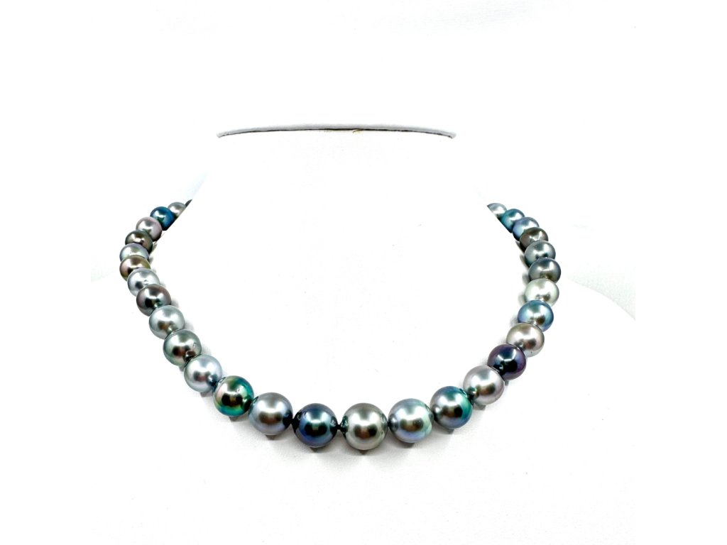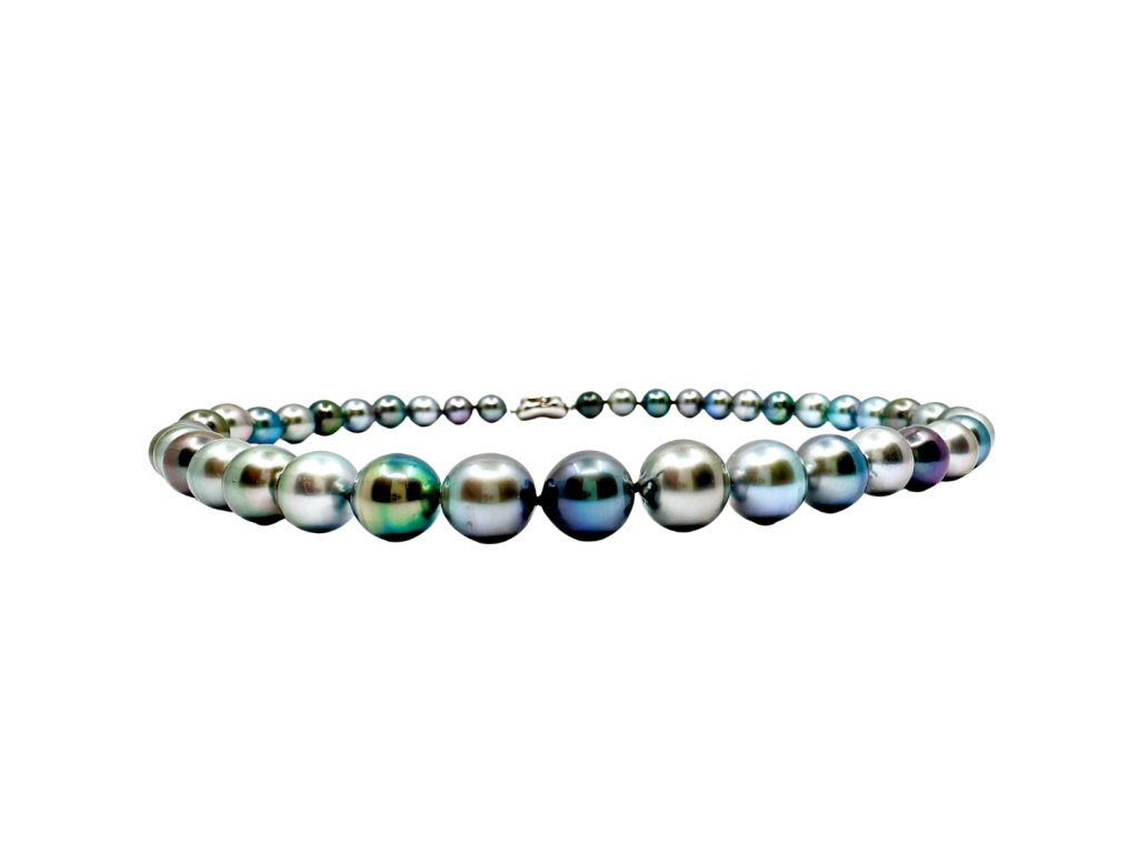 Tento dechberoucí náhrdelník z pravých tahitských perel je skutečným mistrovským dílem přírody. Každá perla je pečlivě vybraná a seřazená do plynulé kompozice odstínů – od kouřově šedé přes paví zelenou až po fialové a stříbrné tóny. Výsledkem je elegantní a přitom moderní šperk, který vyniká originalitou i luxusem.